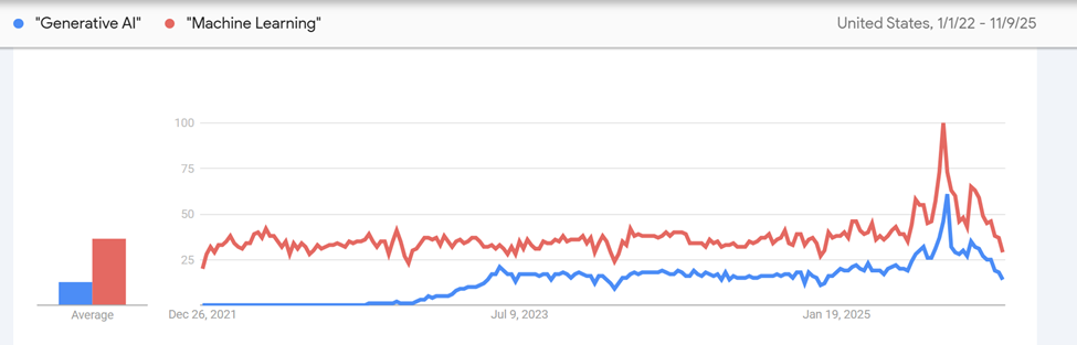 Google search trends show that historically, there is more interest in machine learning than generative AI. Why is that?