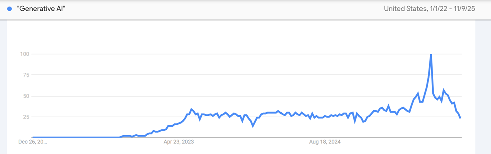 Take a look at Google trends for the term “generative AI” since 2022, when generative models such as ChatGPT and DALL-E were introduced.