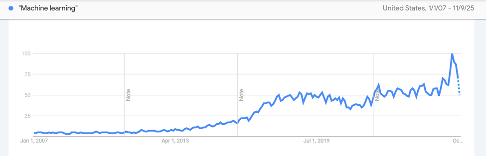 But the term “machine learning” has been a popular search since the beginning of Google in 2007.